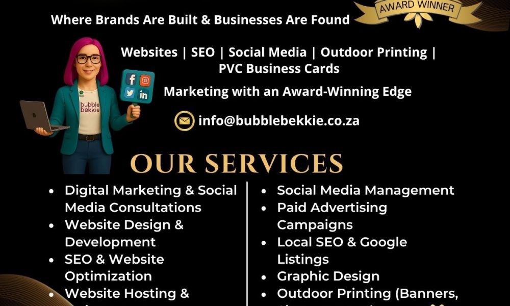 Bubble Bekkie Advertising (PTY) Ltd is a South African award-winning digital marketing and printing agency, established in 2020. We provide tailored marketing solutions including website design, social media management, paid advertising, SEO, graphic design, and high-quality printing services such as PVC business cards, banners, and outdoor signage. We work with businesses locally and internationally, delivering innovative, results-driven campaigns that grow your online presence and create impactful offline marketing materials. Our commitment is to make your brand stand out loud, proud, and professional—wherever you are.